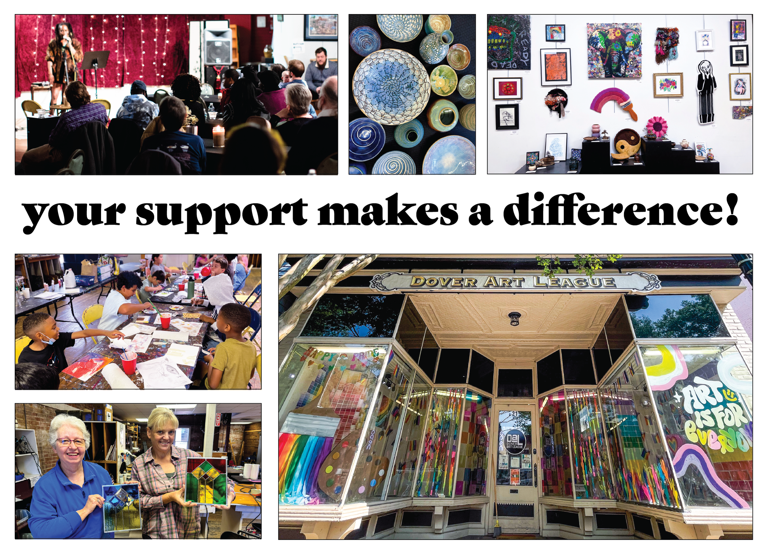 As a small organization, every dollar truly makes a difference. Every gift helps keep art accessible, affordable, and alive in Dover.